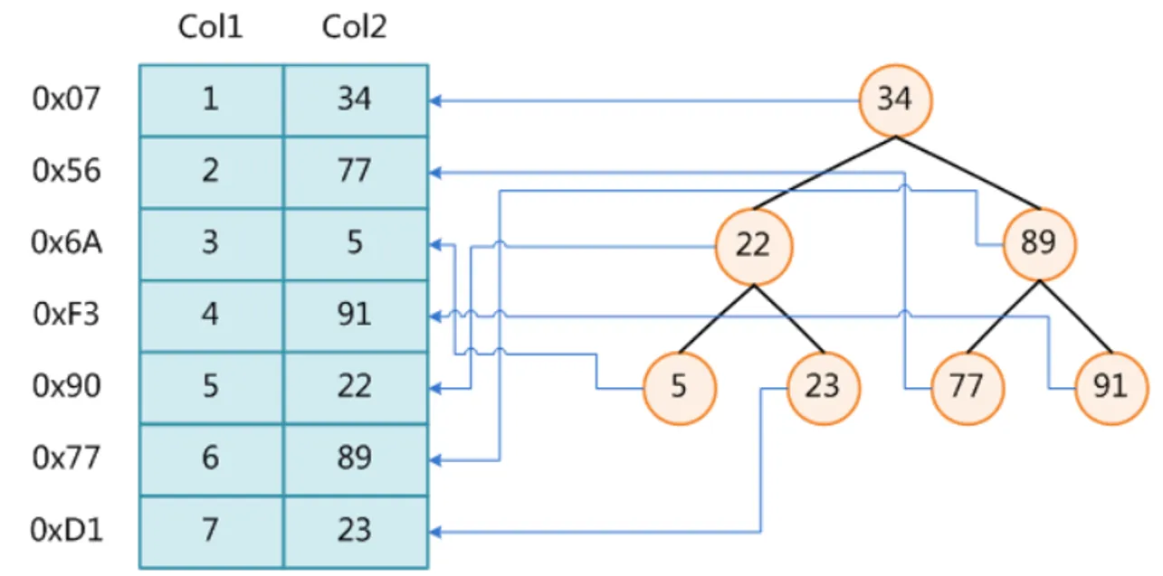 以查找col1=30为例,会先根据MYI文件中的索引结构定位到30那一行在MYD文件的地址,再去MYD文件中定位具体的数据。
