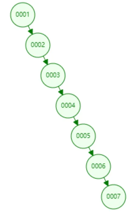 我们把树的节点中存放key-value键值对,比如key就是索引字段的值,value就是索引所在行的磁盘文件地址。查找时从根节点查找,二叉树的特点:右边的元素大于父元素,左边的元素小于父元素。这样上述的SQL只需要经过两次查找就可以了。但是MySQL并没有选择二叉树做为索引结构,因为对于值是单边增长的数据列,最终会变成类似链表的结构,对我们查询没有帮助。