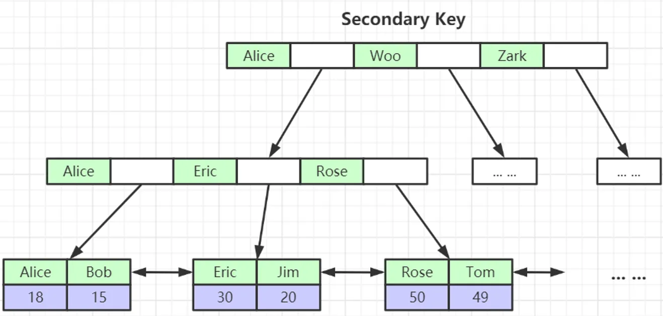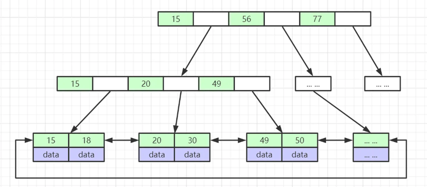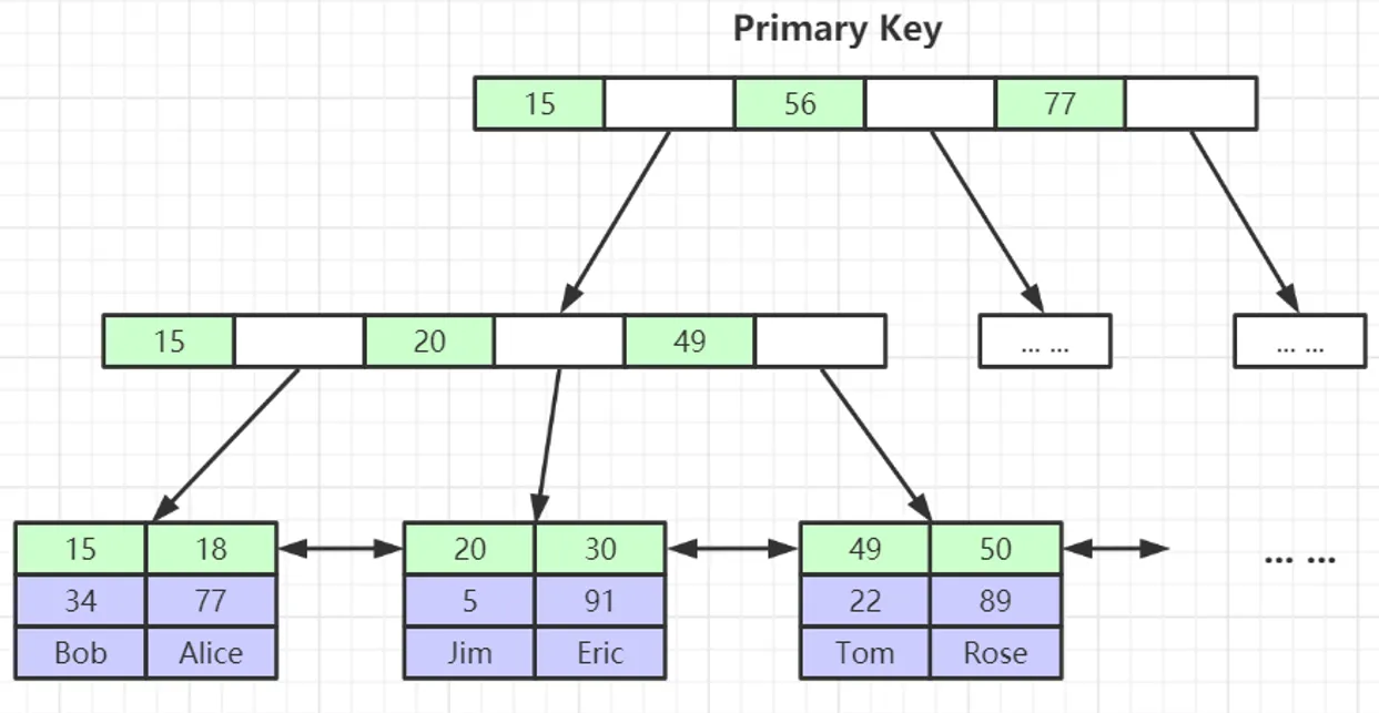 )。 这种设计使非叶子节点更紧凑,能在内存缓存更多层级。叶子节点通过双向链表串联,高效支持WHERE id>100