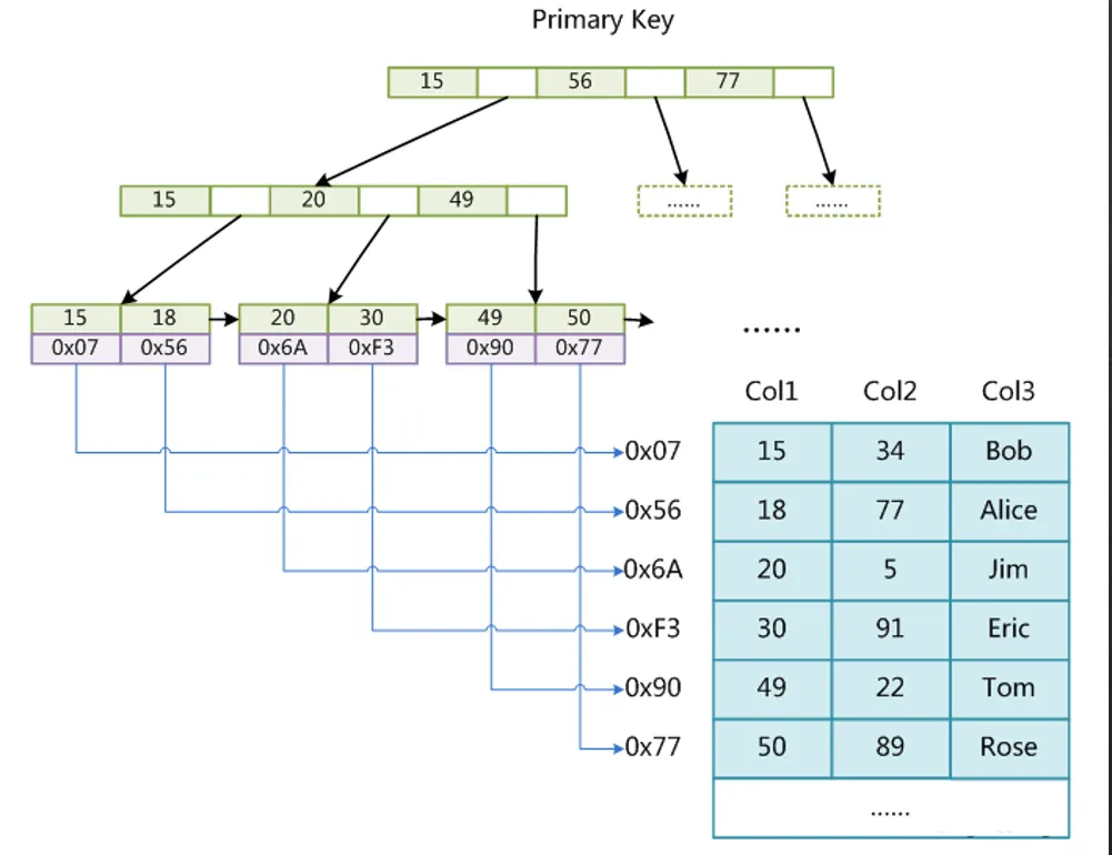 如果要查找col=30,从根节点开始查找,把根节点的元素全部load到RAM中,可以使用折半查找(二分查找)等算法快速定位30位于15和56之间,通过指针就可以找到下个数据页在磁盘的地址,再把下个数据页load到RAM,继续折半查找,直到找到30,再根据磁盘地址load进内存返回。