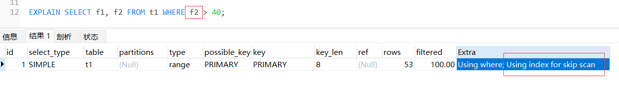 虽然我们的SQL中,没有遵循最左前缀原则,只使用了f2作为查询条件,但是经过MySQL 8.0的优化以后,还是通过索引跳跃扫描的方式用到了索引了。