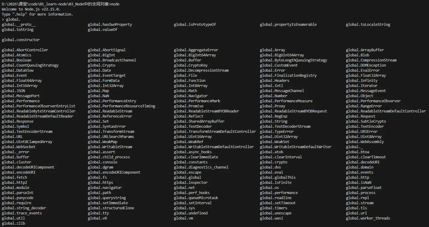 在交互式命令行,输入global.按两下Tab