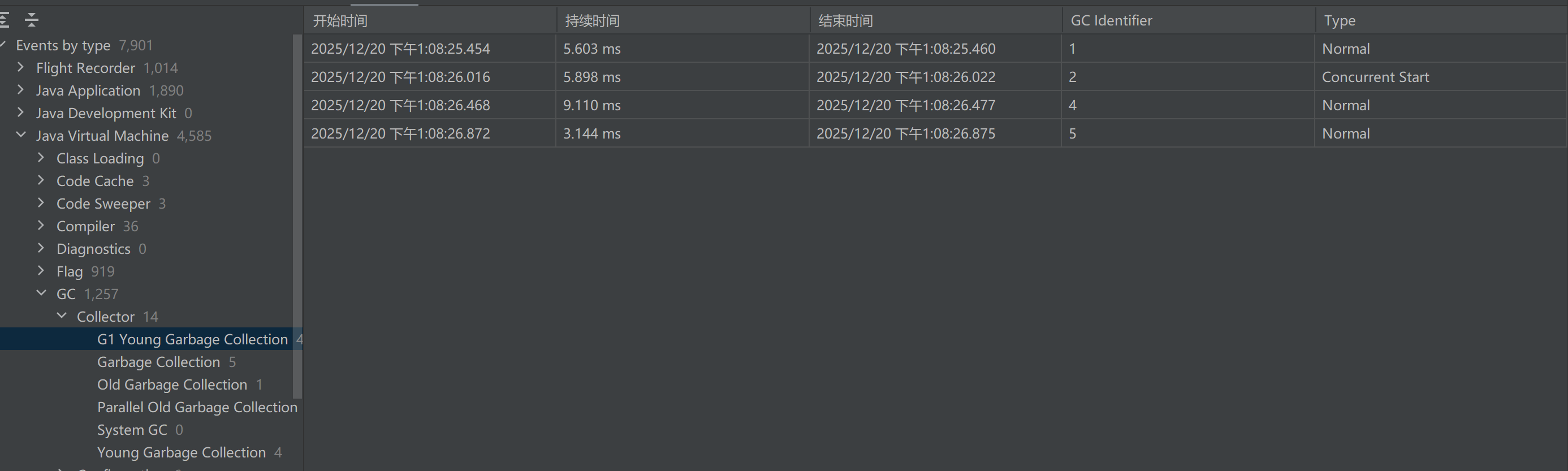 上图表示做了4次Young GC,1次Old GC,共5次,每次GC的开始时间、总耗时都有记录。