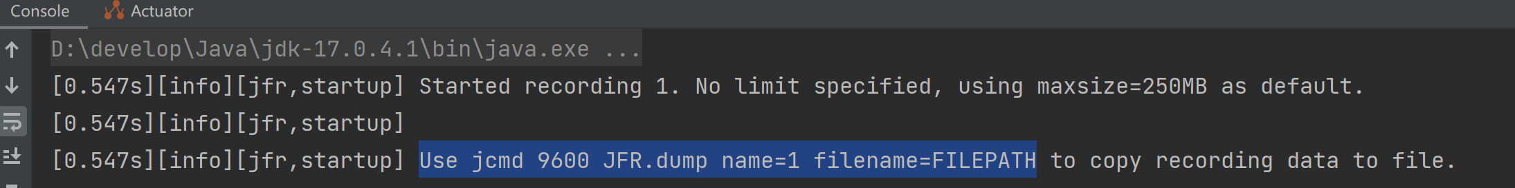 表示可以在程序运行过程中使用jcmd 9600 JFR.dump name=1 filename=FILEPATH命令来生成jfr文件,从而可以查看在执行命令之前应用程序内部发生的各种事件的情况。