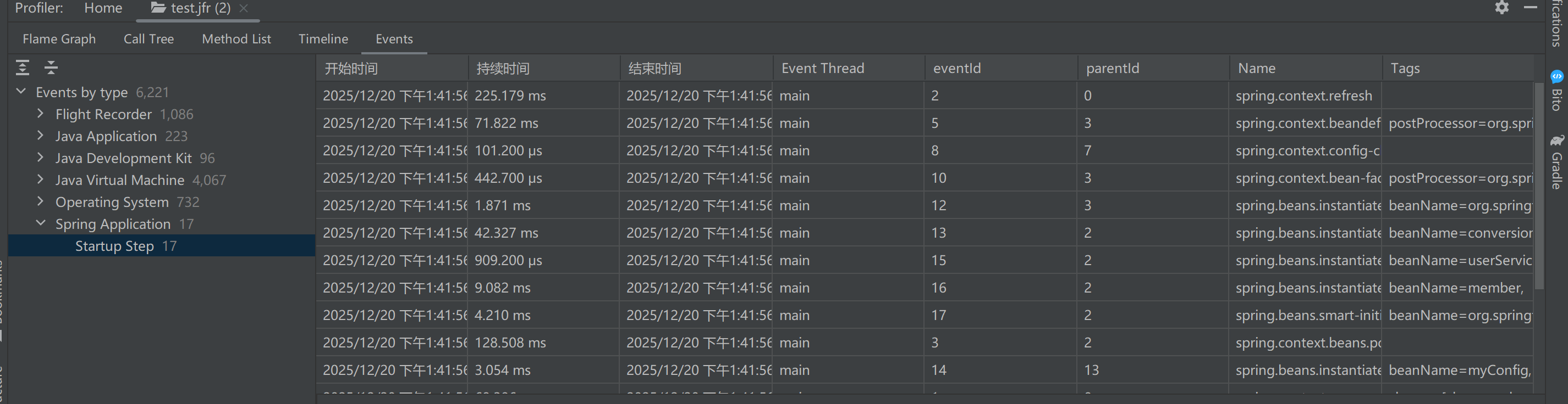 其中spring.context.refresh表示刷新容器的总耗时,spring.context.instantiate表示创建某个Bean的耗时,tags中记录了对应Bean的名字,这样,我们也可以通过JFR机制查看Spring在启动过程中各个步骤的耗时情况。