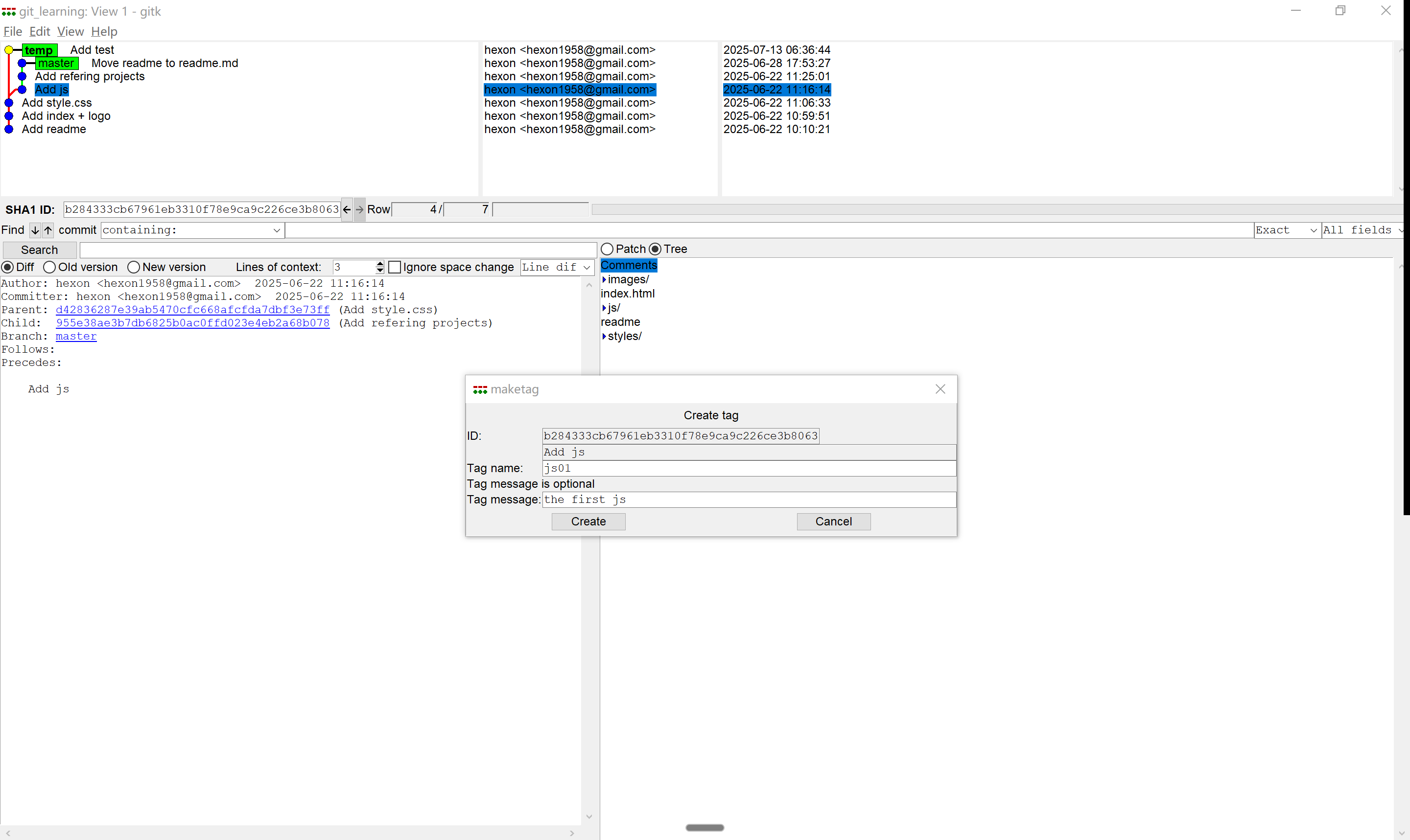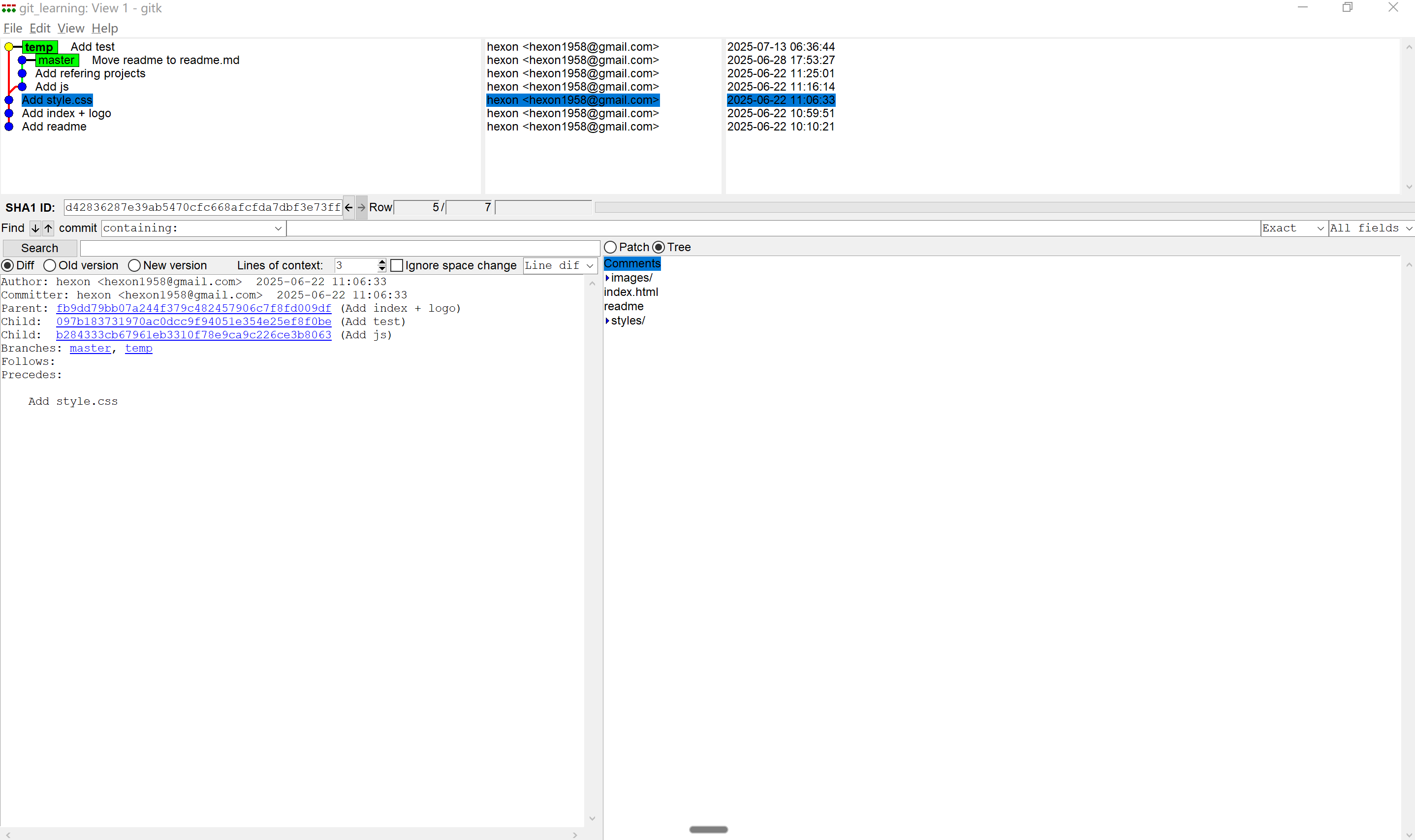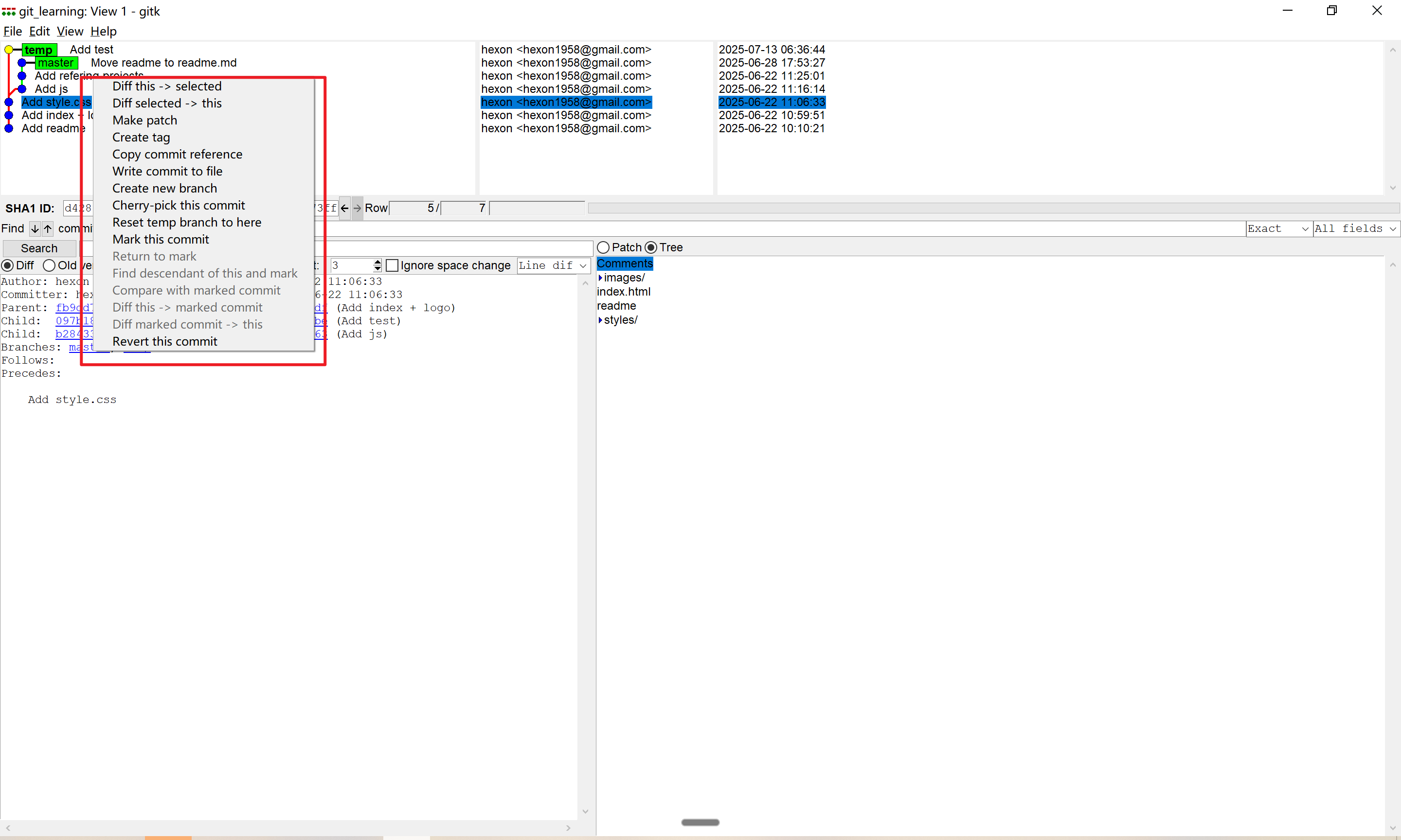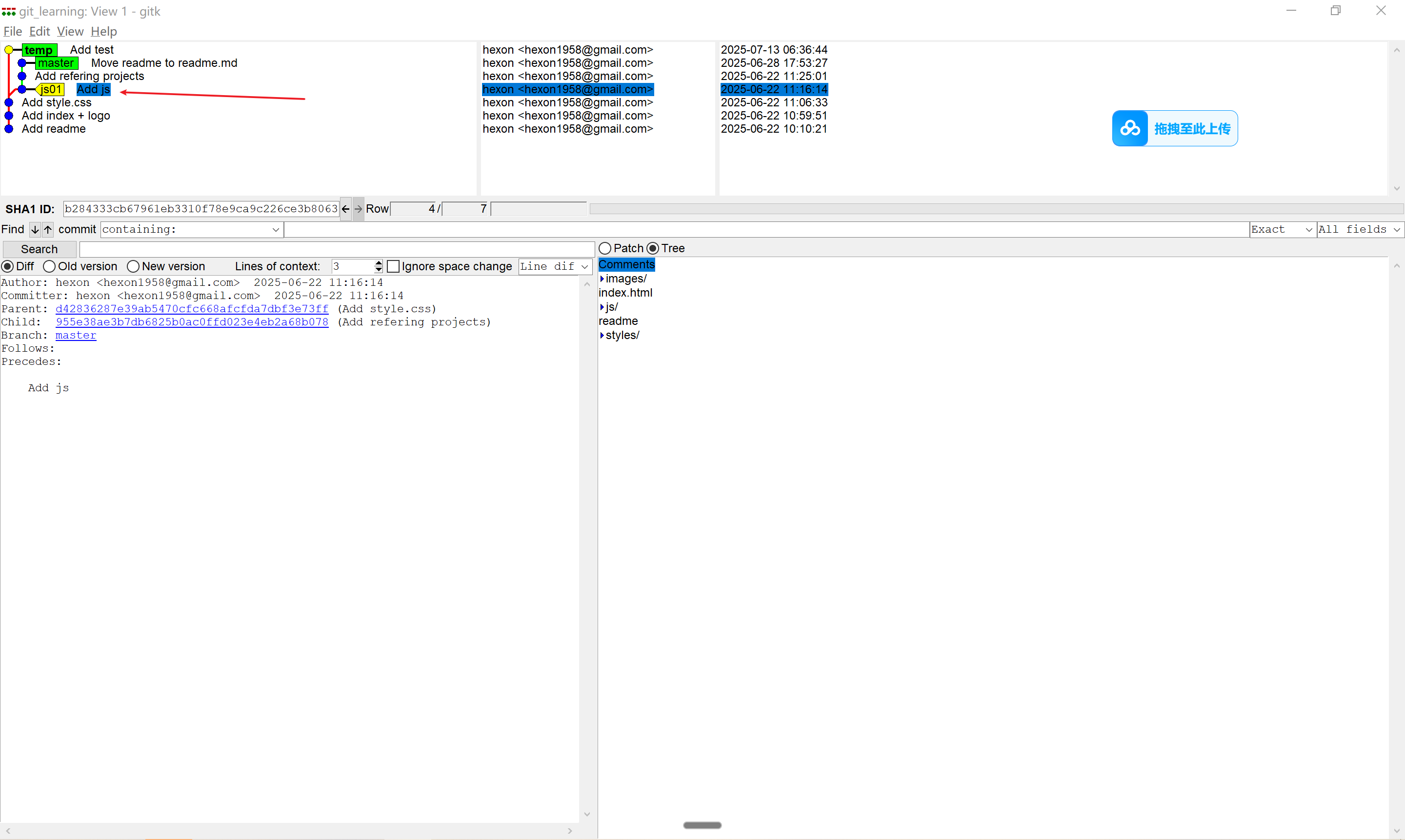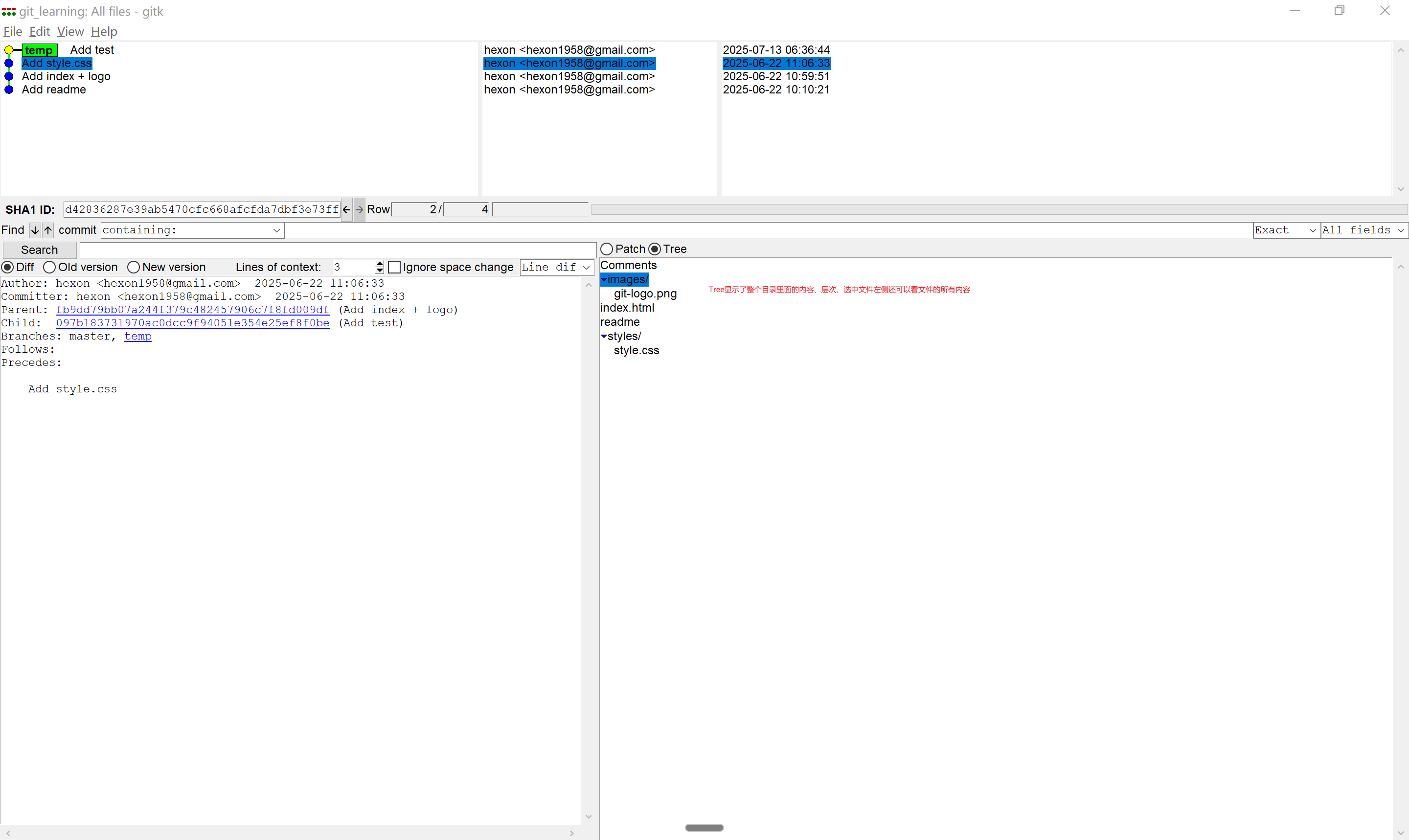 这个界面还是比较直观的,默认是查看当前分支的所有提交历史。左上角是历史树,中间是commit令牌,以背景色区分某次提交。