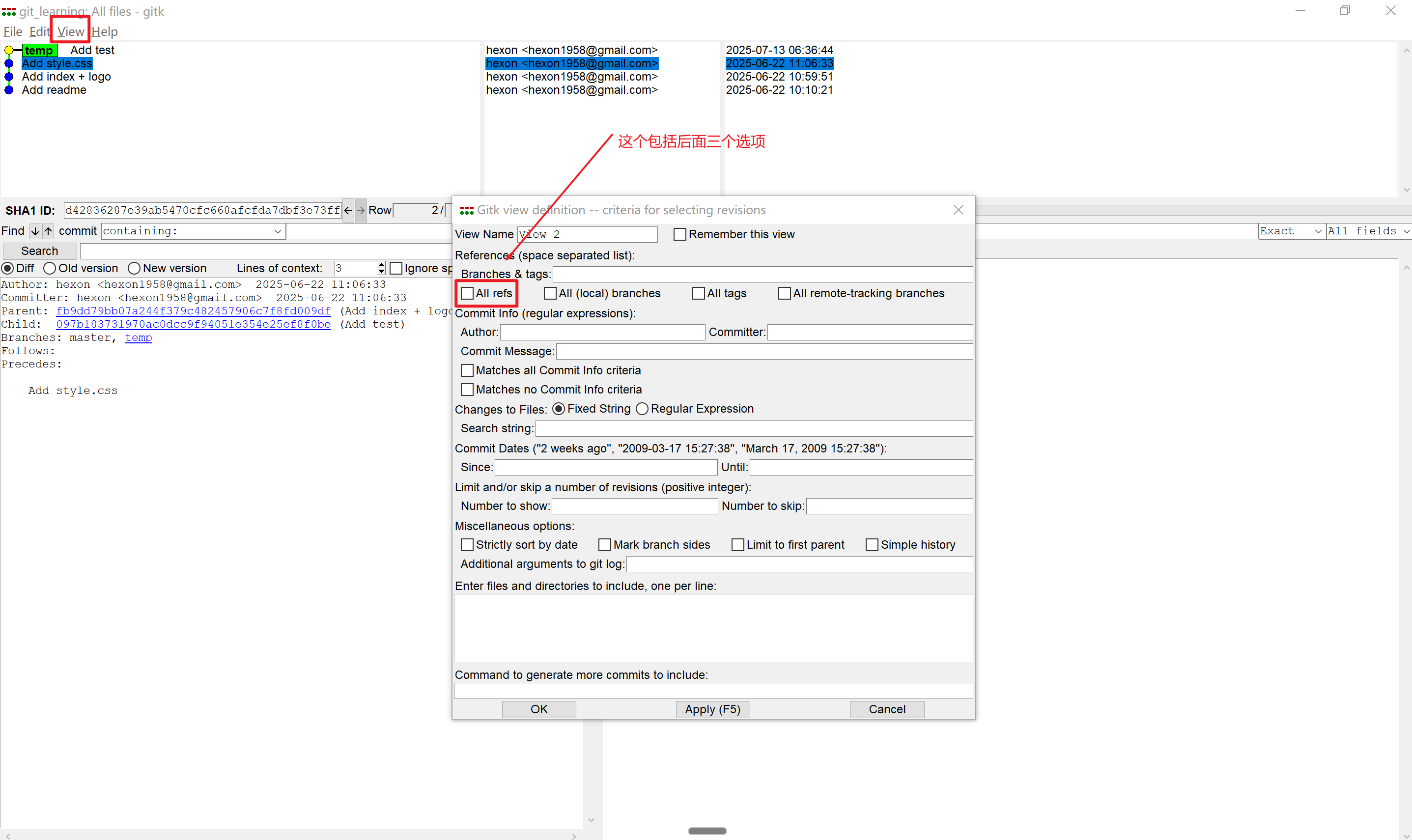 gitk的图形化界面是可以定制的,我们来简单使用一下:
