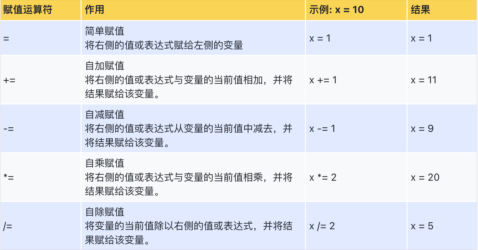# 先将变量x赋值为1,再用x的值加1赋值回x变量,因此x最后等于2。