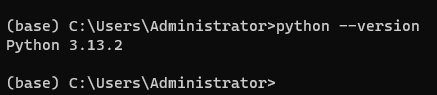 ,如果有看到命令列提示中的(base),那表示安装成功。我们可以输入 python --version