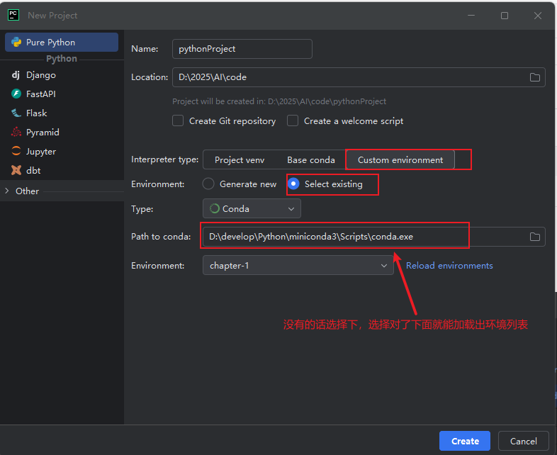 2)创建项目,选择 自定义环境 ,类型选择 Conda ,环境选择上面创建的 ,点击 创建 即可